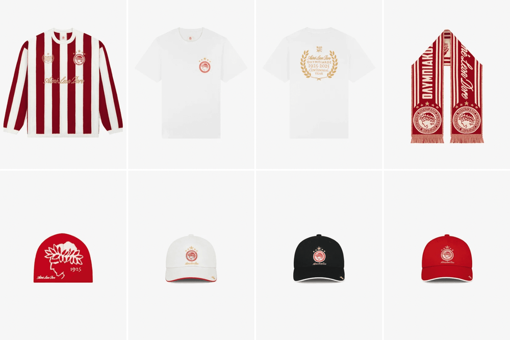The 5-piece mini capsule comprises striped knitted sweaters, scarves, hats, and a graphic tee celebrating the 100-year anniversary of Olympiacos — all decorated with the team’s badge underscored by ALD script-work, in the red, white, and gold colours associated with the “Erythrolefki”.