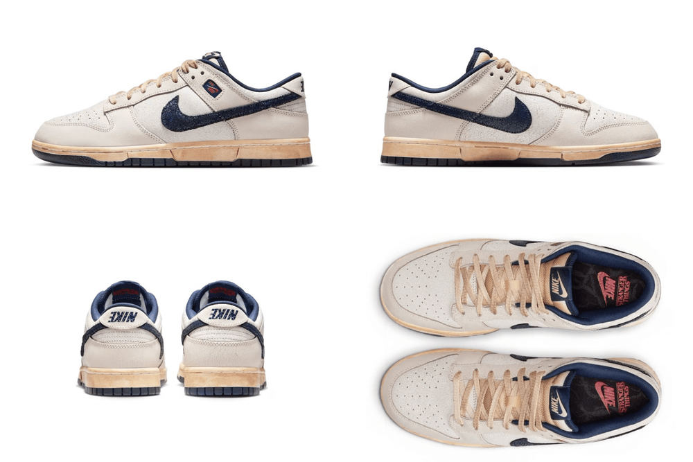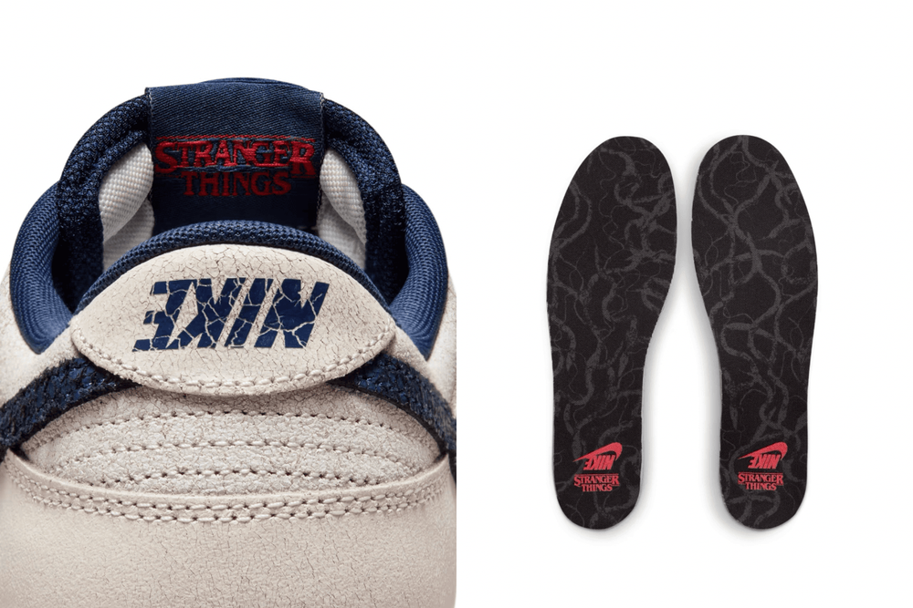Doubling up as a reference to what a Dunk from 1987 could look like today, and the decayed appearance of Stranger Things’ alternate dimension — the “Upside Down”, the Dunk Low features an intentionally cracked leather makeup, complemented by pre-patina midsoles and laces that are “stained from unexplainable exposure”.