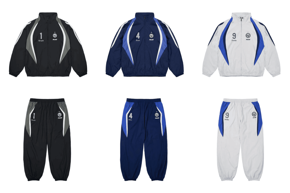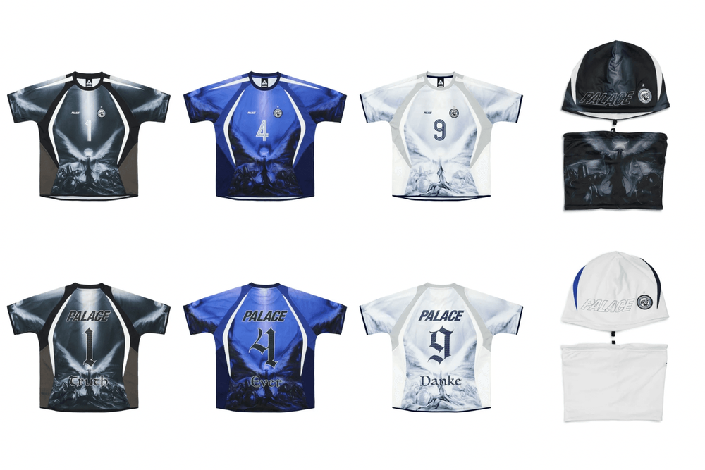 More instances of clever Palace wordplay are evident throughout the Phantasy range of jerseys, tracksuits and 2-in-1 Gaiter Beanies. Sticking with its usual “home, away & third-kit” formula, the headgear and jerseys use an all-over design reminiscent of fantastical, borderline-gothic artwork — contrasting against the printed graphics referencing familiar Palace phrases, such as “1 Truth”, “4 Ever”, and “9 Danke”.