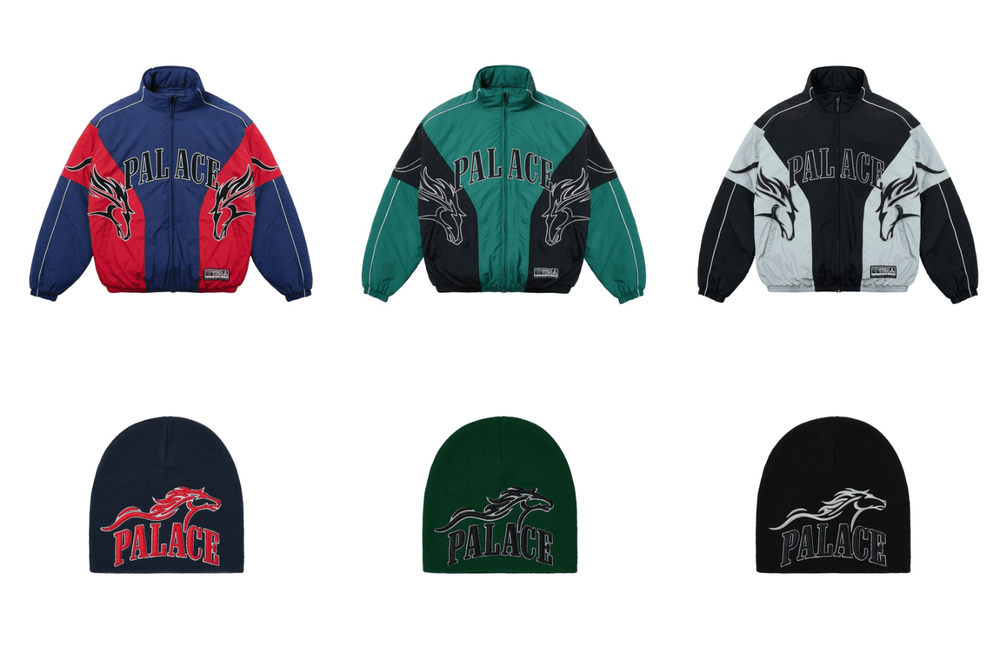 Another major visual theme for the season is the “Horsepower” graphic, which takes cues from Palace’s well-documented love for racing culture — acting as the centrepiece of Nein Cuff Beanies and Horses Jackets.