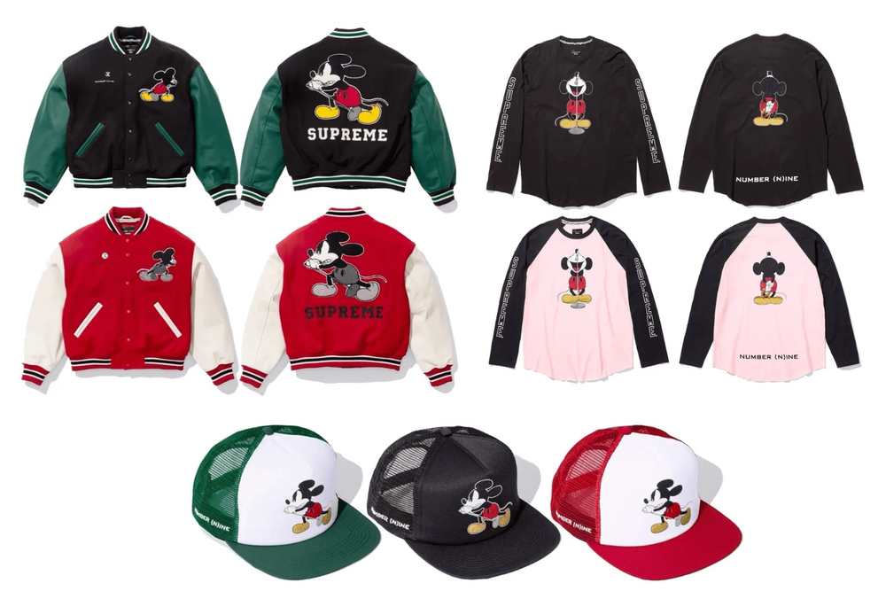 Collaborating for the first time, Supreme and Number (N)ine join forces over Varsity Jackets, Raglan Tops and Mesh-Back 5 panel caps — each applied with both parties’ logos and Mickey Mouse posing in front of a microphone.