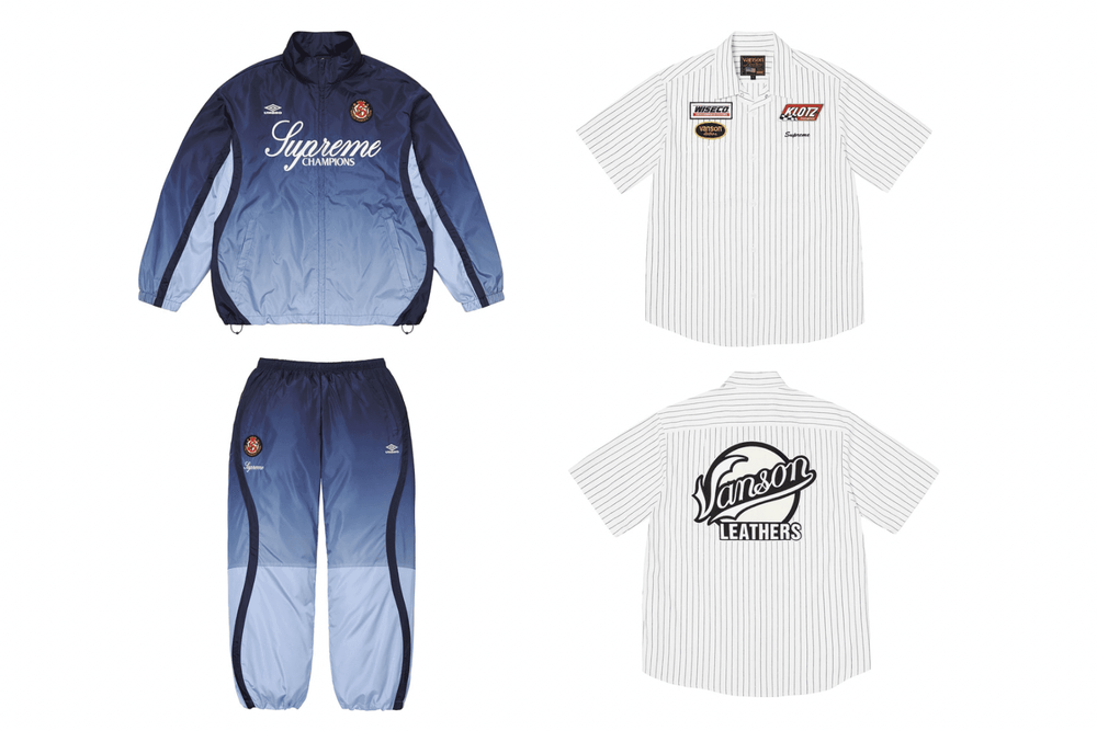 Acting as the background band members to the headlining Number (N)ine collab, Supreme is also dropping a series of under-the-radar collabs with familiar names such as Vanson Leathers and Umbro — whose respective themes of Americana motorsports and golden age sportiness are applied to Work Shirts and Gradient Track Jackets & Pants.