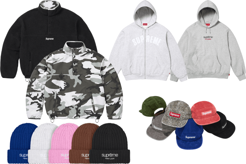 The same Classic logo is applied to a range of Chunky Rib Beanies, while more staple Supreme branding appears on the Arc Thermal Hoodies, Polartec Shearling Pullover, Corduroy Camp Caps, and Textured Knit Beanies.