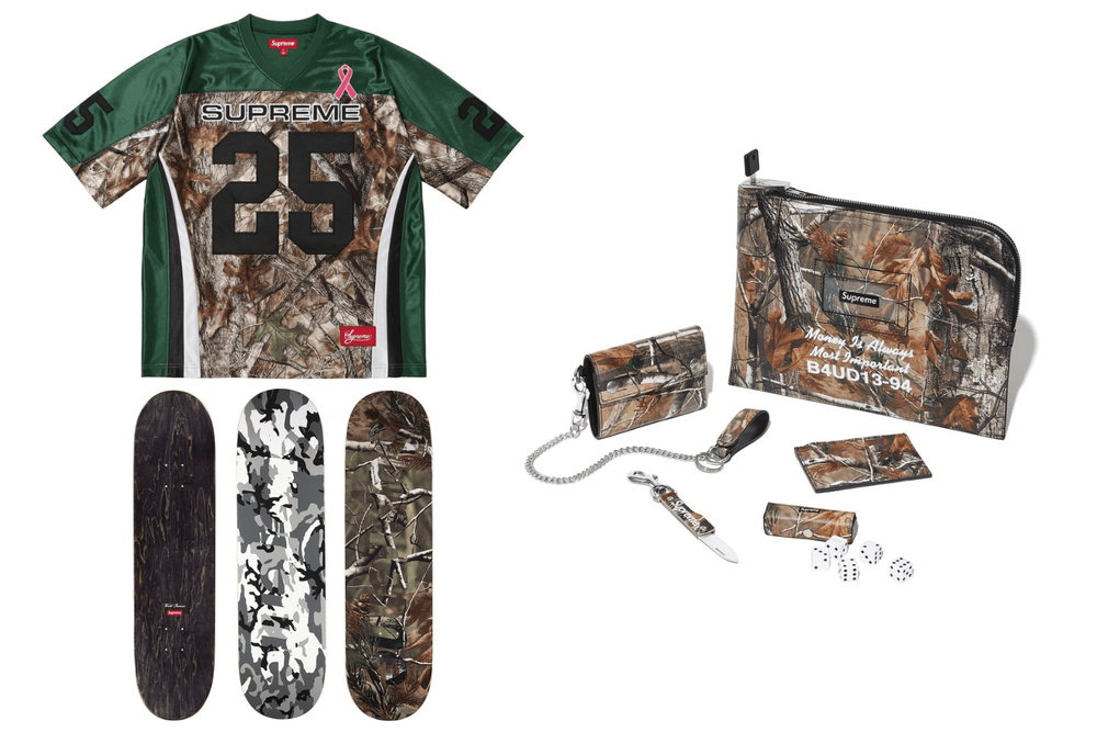Realtree Camo features prominently in the latest drop — first on Football Jerseys supporting the Breast Cancer Awareness movement, again on one of the new Ripstop Camo Skateboards, then all throughout the seasonal restock of Supreme’s Italian-made leather goods, which comprises Money Bags, Card Holders, Wallets, Leather Dice Sets, and Clip Knives.