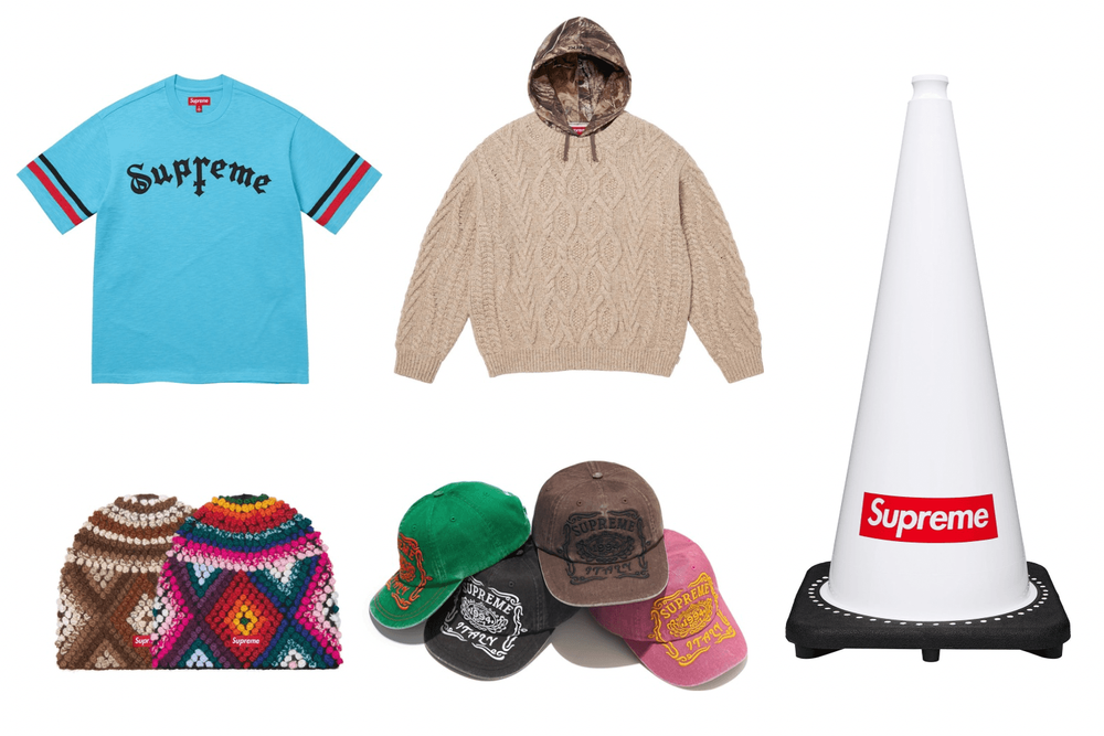 Closing out the drop are unconventional Cable-Knit Crewnecks with integrated “hoodie” hoods, the Cross S/S Top, Italy 6-Panel Caps, and a return to random form, via the box logo-branded Supreme Traffic Cone.