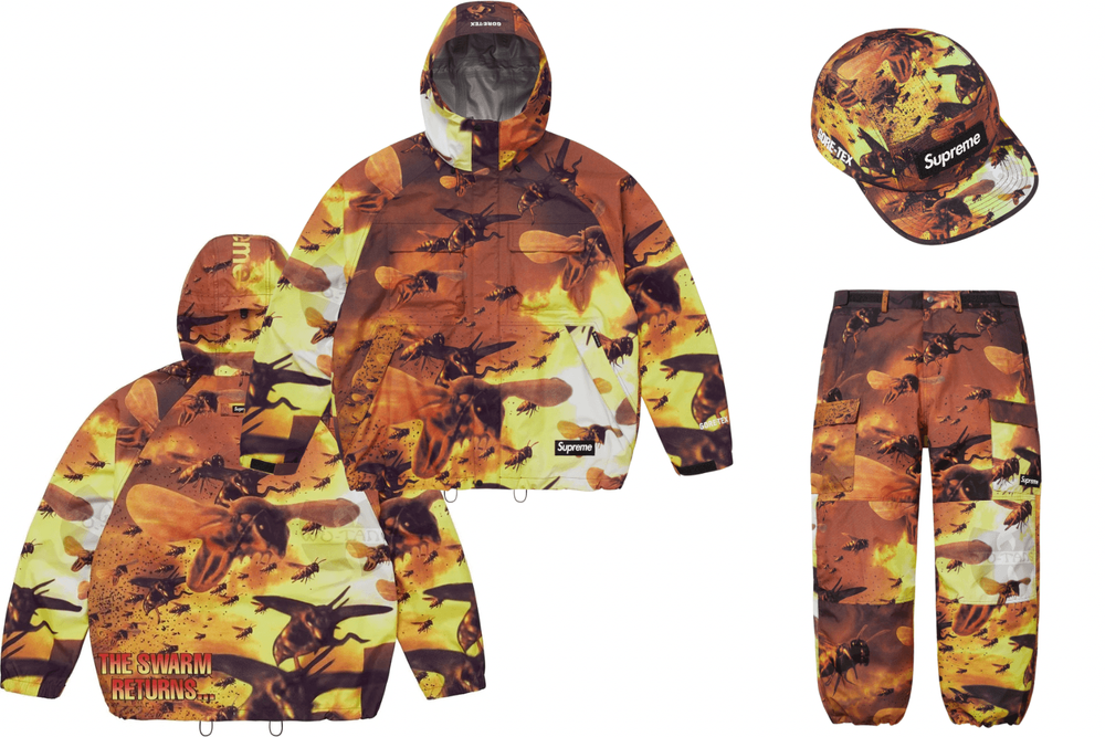 A swarm of Killa Bees fly in on a matching Gore-Tex Shell Jacket, Cargo Pant & Camp Cap set, alongside a collectible skateboard and two jerseys applied with branding placements reminiscent of peak y2k Wu-Wear.