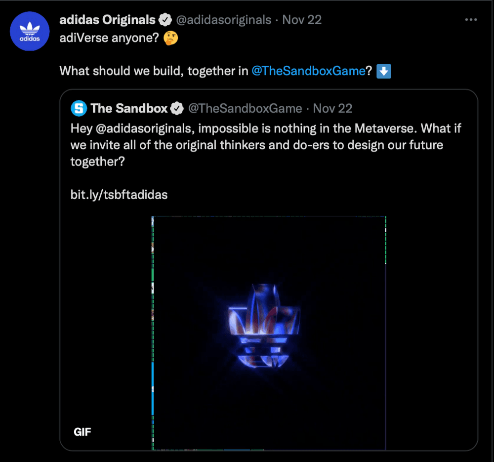 Adidas then staked their claim to a virtual plot of land in the fast growing world of “The Sandbox” - a community driven platform, loosely based on games like Minecraft and Roblox, that allows you to build your own world, buy, sell and even create original NFTs.