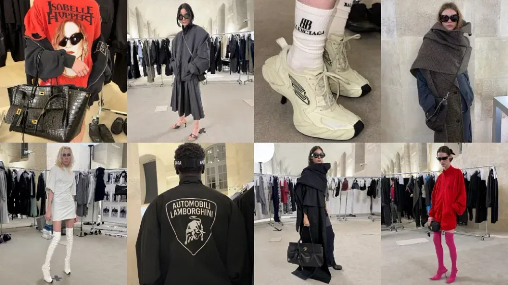 In a press release, Balenciaga highlighted “minimal eveningwear and Garde-Robe looks, transitioning to more conceptual Casual Everyday Outfits, followed by Balenciaga Uniforms, Brand Ambassador fan club merch, and Tracksuit ‘Party Dresses’; demonstrating the large spectrum of Demna’s aesthetic vision.”