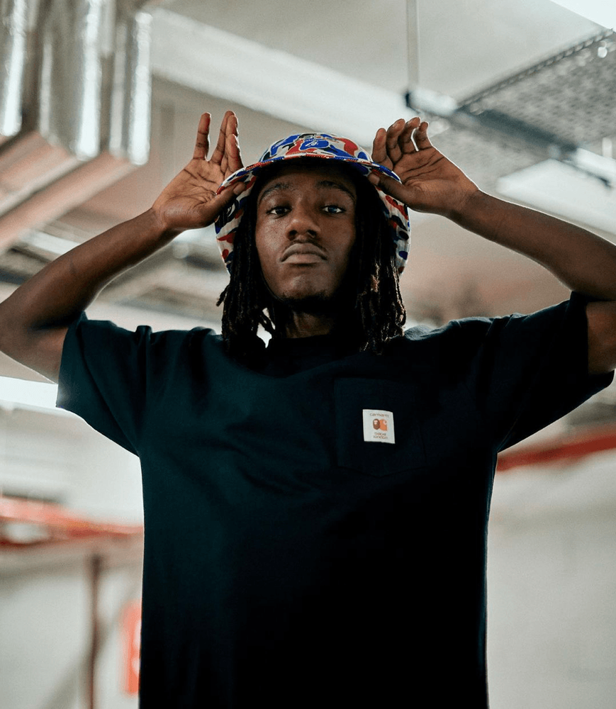 While there is still some mystery over what the full Carhartt WIP collection will contain, a teaser shows a co-branded t-shirt featuring the classic brand badge over the chest combined with the signature BAPE head emblem, plus a bucket hat featuring an all over Union Jack-inspired camp pattern.