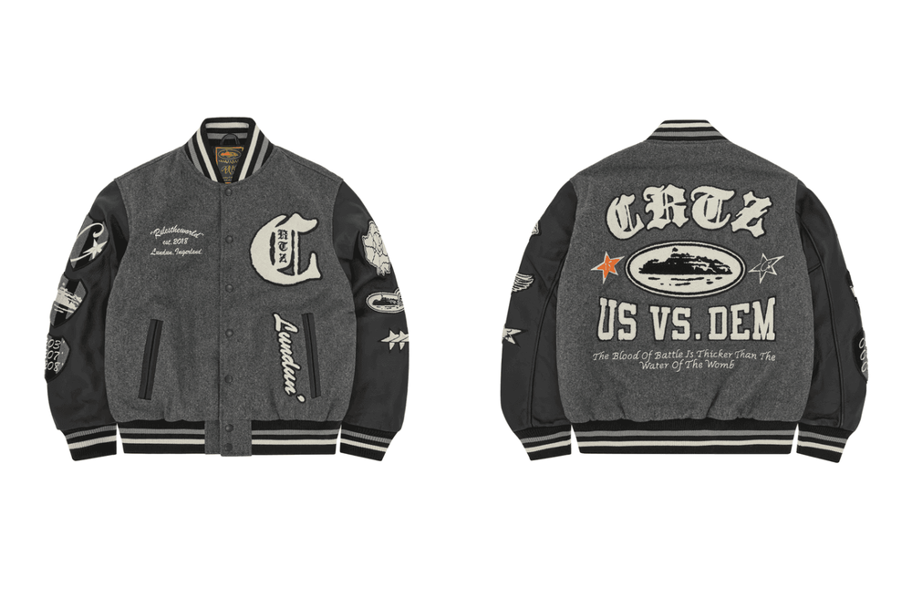 From Corteiz’s all-encompassing array of outerwear options, the Us vs Dem Varsity Jacket stands out, featuring “bare patches” on the torso and arms and boasting a standard quilted inner that lines the wool mid-section and genuine leather arms.