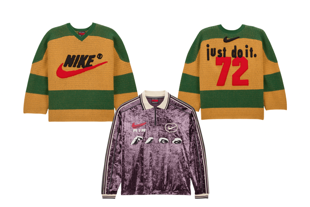 The latest effort from CPFM x Nike focuses purely on loud, sport-inspired apparel, such as knitted hockey jerseys or plush velour polo shirts featuring CPFM’s characteristic riffs on famous Nike symbols and slogans.