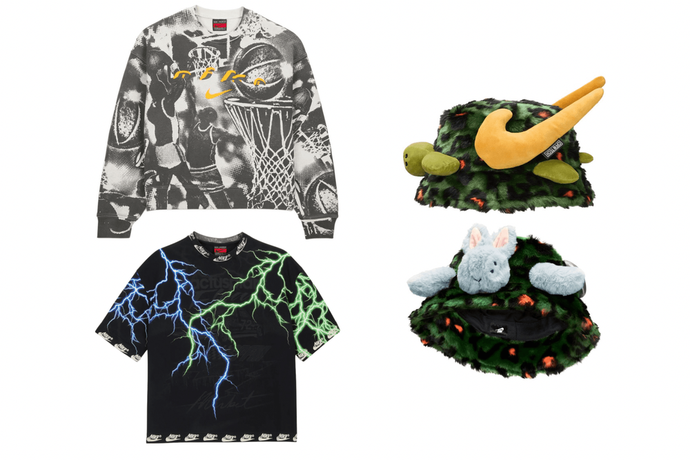 The brands’ shared proclivity for print shines through on a sweatshirt and tee, where the larger-than-life playfulness reaches a boiling point with faux-fur bucket hats adorned with 3D plush bunnies and turtles, complete with Nike Swooshes included as pseudo-ear “wings”.