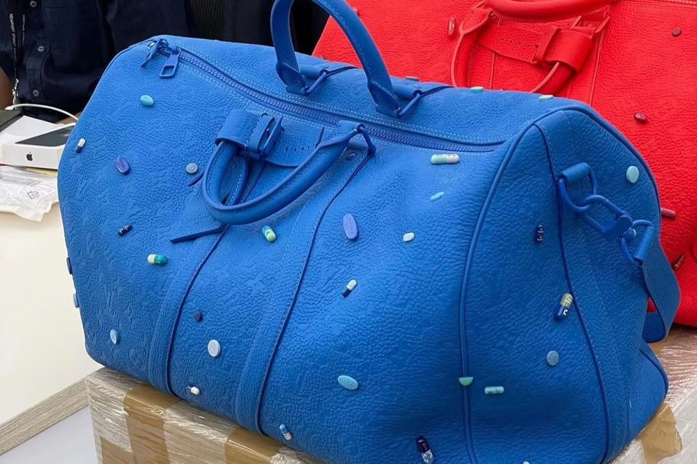 The red and blue Keepall bags have been plied with various “pills” in an all over format. Medicine has remained a distinctive component of Hirst’s artwork since the 1980s, most notably featuring in his 2002 piece Spring Lullaby, which sold for $19.2 million USD at auction.