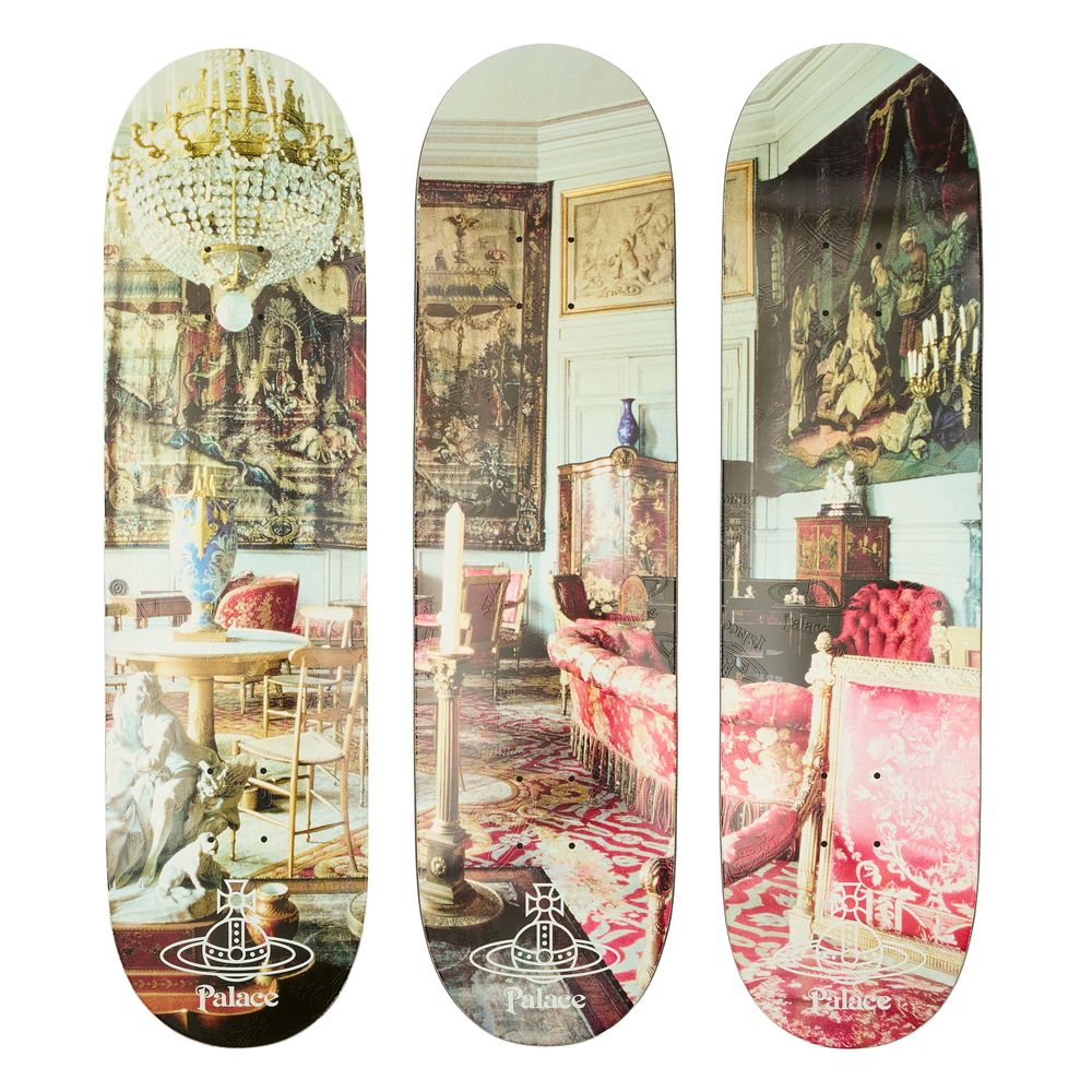 Encapsulating this energy is a collection of GORE TEX hooded jackets, track pants, skirts and skate decks printed with the Vivienne Westwood ’Salon‘ imagery.