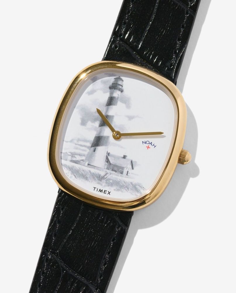 The design draws on the Art Deco-inspired references popular during the early-to-mid 20th century, featuring a gold-toned case housing a white dial with the lighthouse graphic etched on the front, joined by Noah and Timex logos, respectively placed at the 3 and 6 o’clock positions.