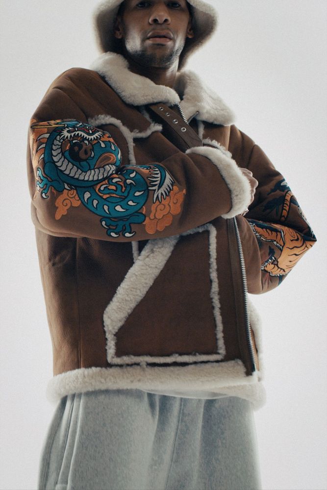 Another star of the show is an embroidered shearling jacket with embroidered details down each sleeve, the dragon flying across a dreamy cloudscape and a tiger stalking down a mountain scene.
