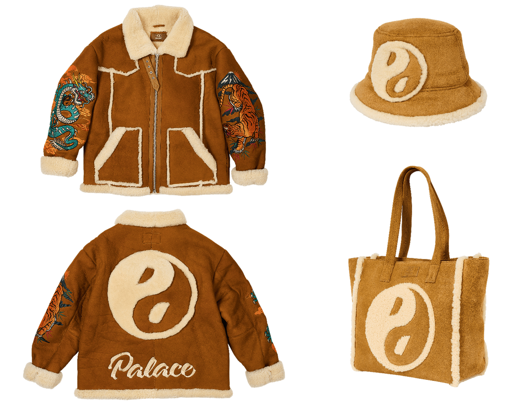 Finished at each edge with shearling fleece, the statement piece jacket is signed off with a fluffy peace sign and stitched Palace branding across the back.