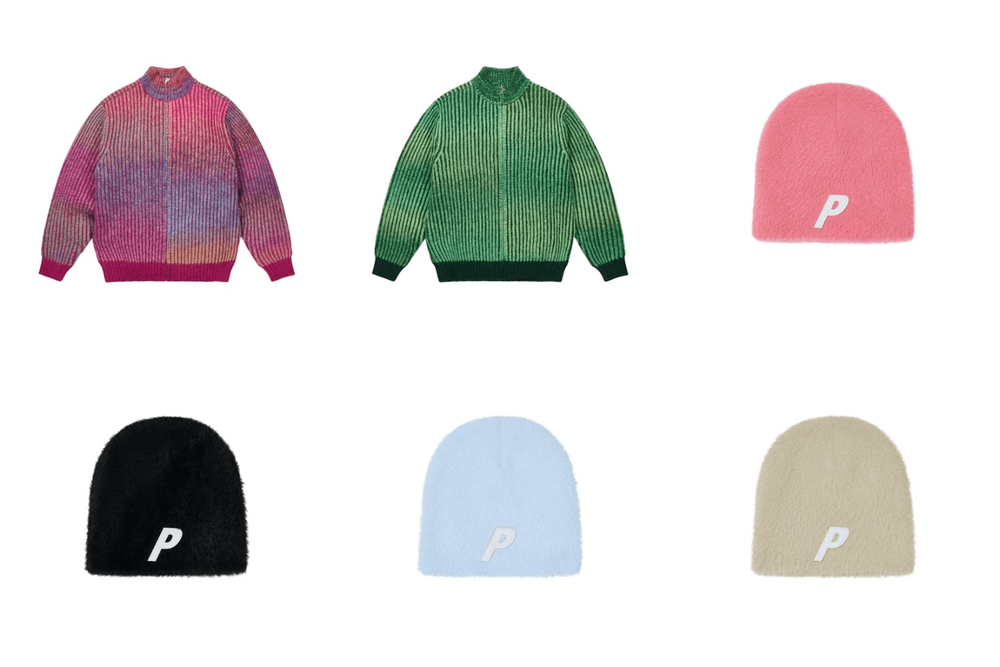 Knitwear is also on full display, as Palace opts for fuzzy textures and neo-pastel hues on the Double Vision knit tops and “faux-hair” P Nein beanies.