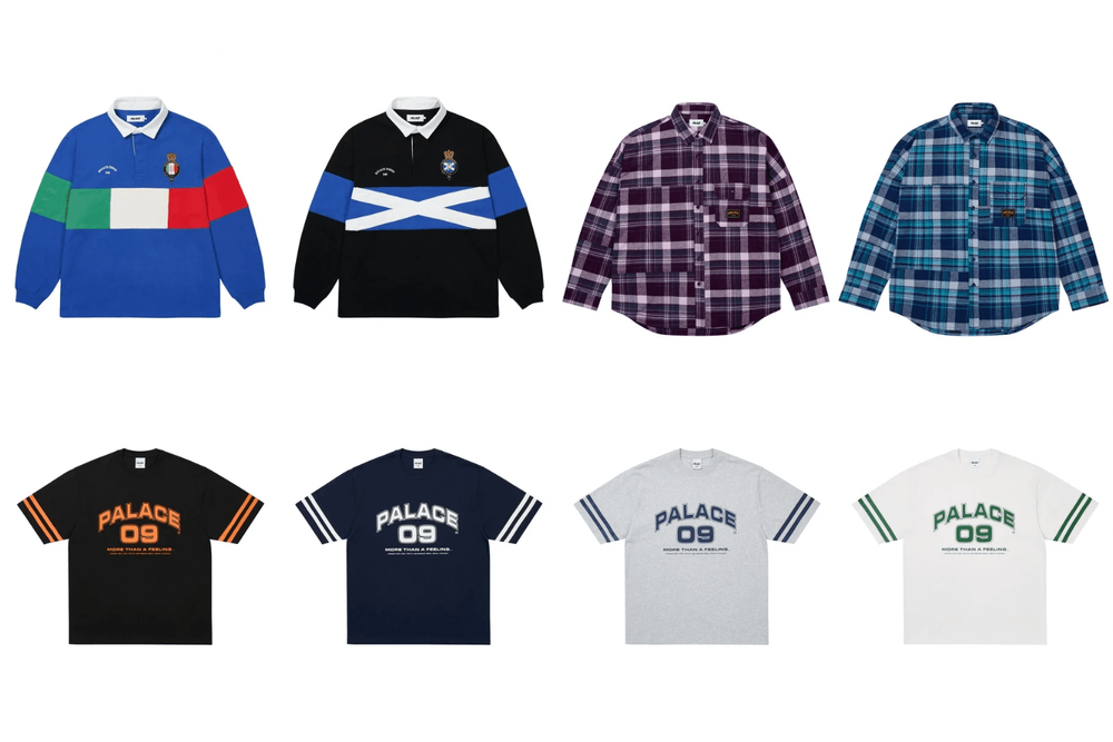 In a similar vein, Palace’s seasonal slogan of “More Than a Feeling” is deployed on heavyweight tees with tipped sleeves, while a surprise instance of international diplomacy takes place on the Scrum rugby shirts, which respectively display the flags of Scotland and Italy.