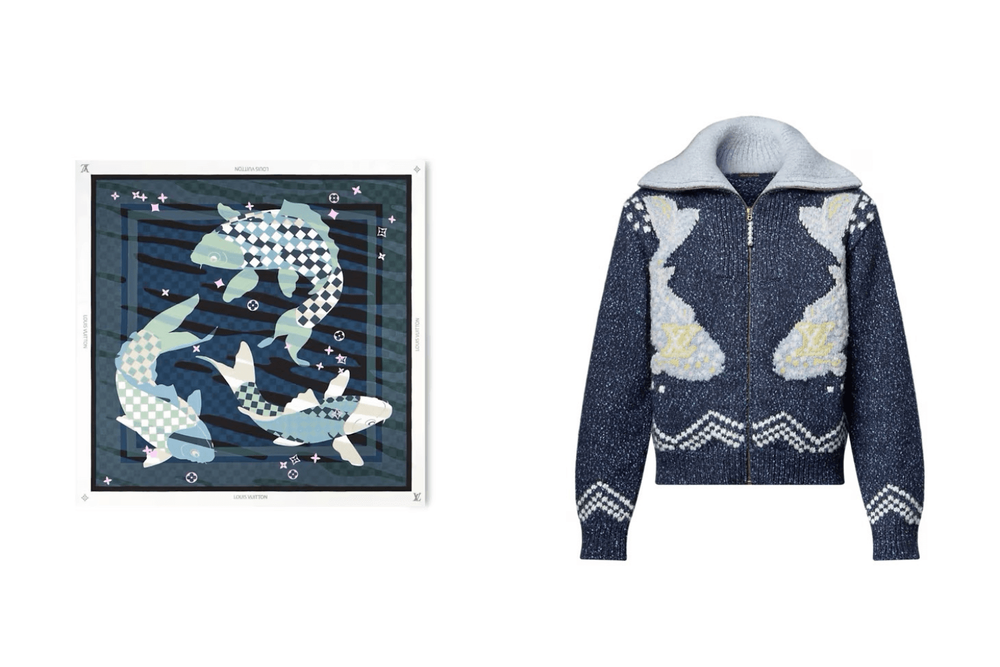 More Japanese imagery comes through via koi-adorned knitwear and bandanas, where motifs associated with the iconic “Souvenir Jacket” (or Sukajan) are repurposed to appear on intricately-embroidered tops and small leather goods.