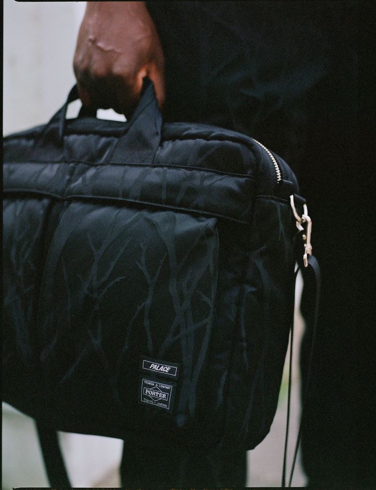 Palace and Porter have developed a unique jacquard design to be implemented across the range, coming in hues of deep black and olive that intensify the already intriguing texture of Porter’s signature nylon textile, with the integrated “branch camo” design seamlessly lending itself to the urban applications of both brands.