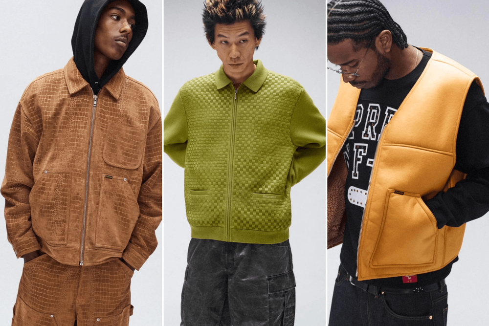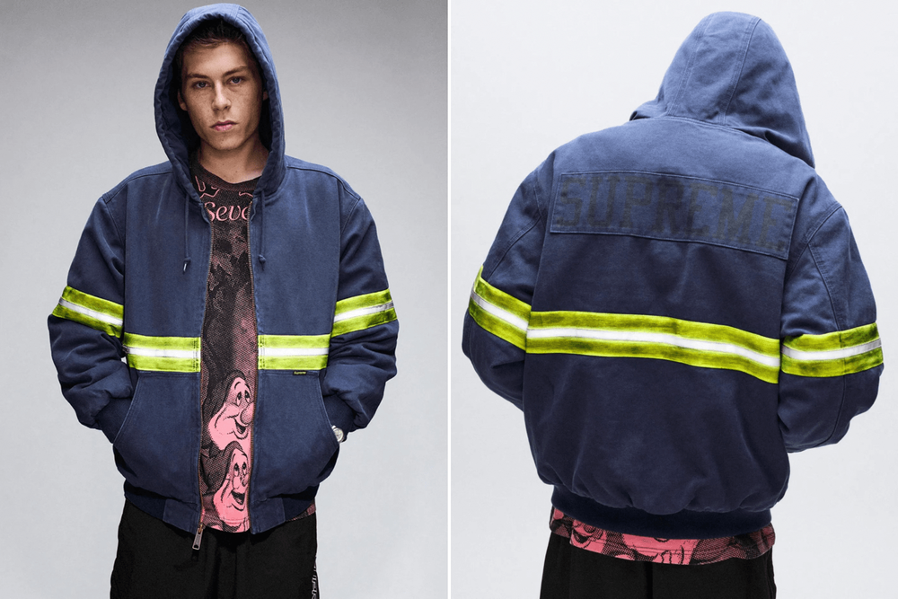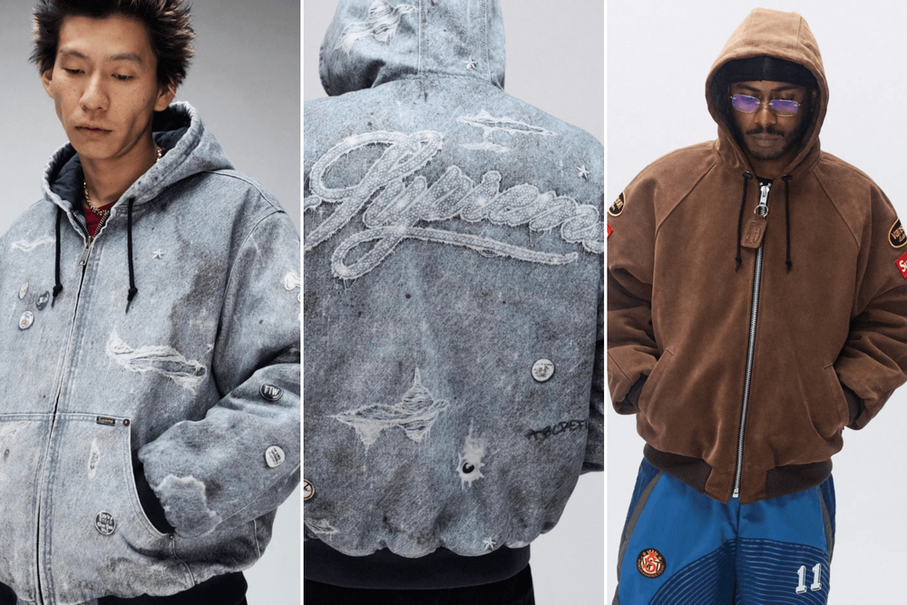 Continuing to exhibit its penchant for workwear, Supreme has put various spins on the classic, hooded work jacket. Starting with the “optical illusion” trompe l'oeil style with artwork from HJR that can be paired with matching jeans, Supreme has also tapped Vanson leathers for suede and leather variations with added arm patches and custom zip toggles.