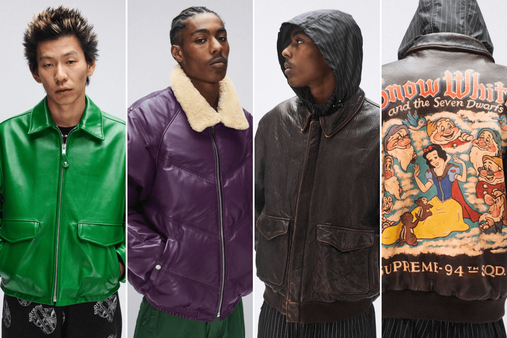 The Fall/ Winter season brings about numerous pieces from serial Supreme collaborator Schott NYC, that have been commissioned by Supreme to create various leather styles, including this green Racer Jacket, a Chevron-stitched Down Puffer complete with a shearling collar, plus the pre-patina’d, showstopping A2 Bomber thats hand-painted with a kitschy depiction of the OG Snow White and her Seven Dwarfs.