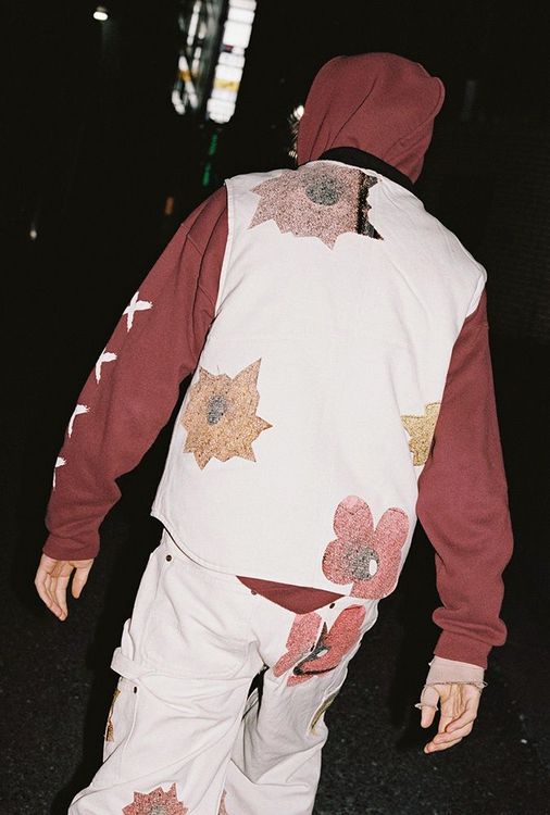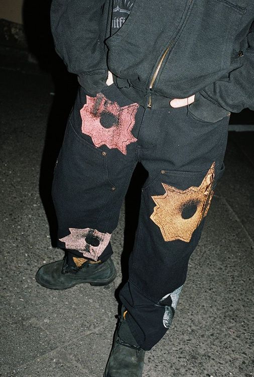 The bullet hole graphic is printed onto items including the denim work vest, knit sweater, double knee painter pant, hooded sweatshirt and shortsleeve shirt and features the blurring, halftone effect occurring when an image is repeatedly photocopied, as in print ads.