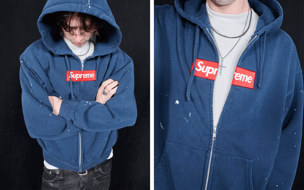 In a brand first for Supreme, the collection features the first ever zip-through version of the infamous box logo hooded sweatshirt, styled in a distressed, paint-splattered finish.