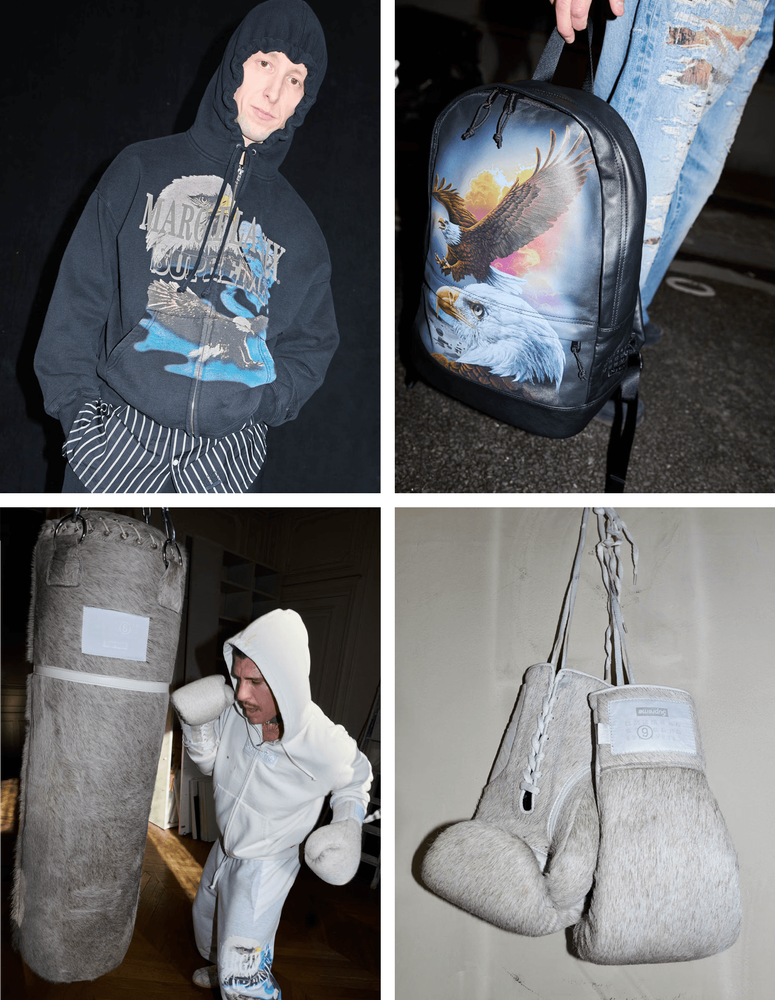 Displaying the irreverent and youthful approach the MM6 line is known for, the collection features unexpected fur textures, rip and paint splash distressing and tear-away reveal eagle graphics.