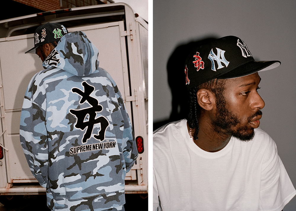 The full collection with Supreme celebrates the brand's shared New York heritage with the interlocking "NY" logo used across a New York Yankees™ Kanji Varsity Jacket, hooded sweatshirt and sweatpants set and New Era cap.