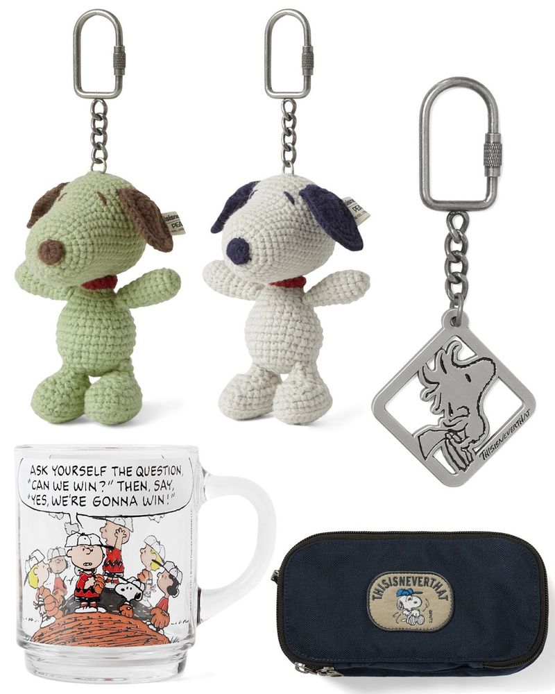 A set of of graphic t-shirts celebrates the classic illustration style and 4-panel format while the super cute accessory collection includes two vintage look caps, Snoopy as a crochet plush keychain, a handy multi-zip pouch and an illustrated glass cup.